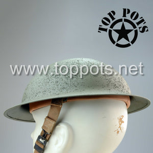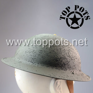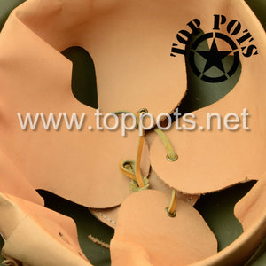 This is a reproduction of the early model WWII USMC M1917 Helmet with transitional pre-war leather covered liner, khaki webbed chinstraps and aluminium framed liner. It comes complete as shown with WWI era United States Marine Corps Eagle, Globe and Anchor (EGA) insignia mounted in the crest. The leather M1917 liners are one size fits all.